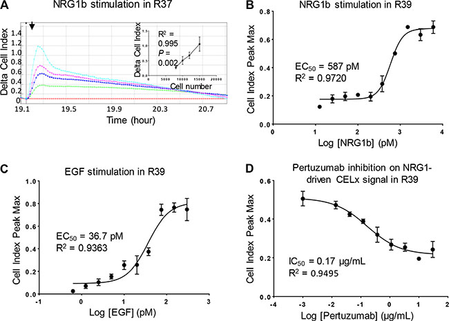 An NRG1b titration series from 375 pM to 12 nM and an EGF titration series from 25 pM to 800 pM were performed during assay development. A single dose of 3 nM for NRG1b and a single dose of 0.3 nM for EGF were chosen for CELx HSP testing of all samples that represented a maximal signal plateau for samples with different levels of HER receptors.