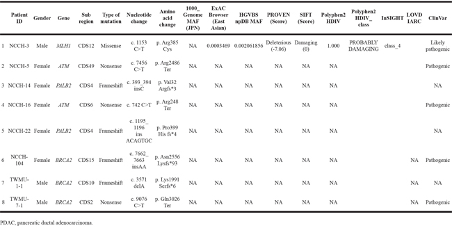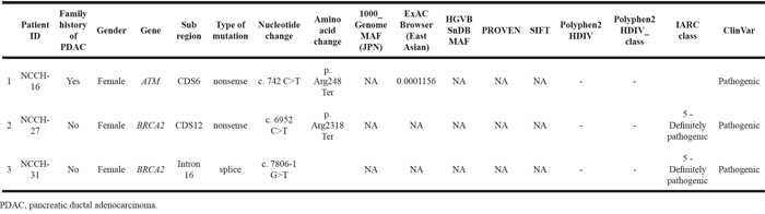 Although there have been three studies reporting that a significant fraction of patients with PDAC have a family history of PDAC (10 out of 200, 5.0%; 40 out of 577, 6.9%; 28 out of 688, 4.1%) in the Japanese population [11–13], the prevalence of deleterious FPC susceptibility gene mutations in the Asian population is poorly described.
