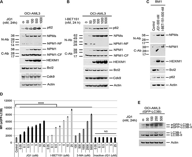 Figure 3: Effects of BET inhibitors on protein expression and autophagy. (A, B, C) OCI-AML3 cells or primary NPMc+ AML cells from patient BM1 were treated with I-BET151 or JQ1 at the indicated concentrations for 24 h, followed by Western blot analysis of the proteins shown. (D, E) OCI-AML3 cells stably expressing eGFP-LC3B were treated with the BET inhibitors JQ1,I-BET151, 3-MA, or (−) JQ1 at the concentrations shown for 24 h, followed by flow cytometric analysis of GFP-LC3B fluorescent intensity (D) or Western Blot analysis (E). Bar graphs in Figure 3D represent the mean ± S.D. of biological triplicate. NS represents non-significance. Asterisks (***) indicate p < 0.001 in relation to control un-treated cells.