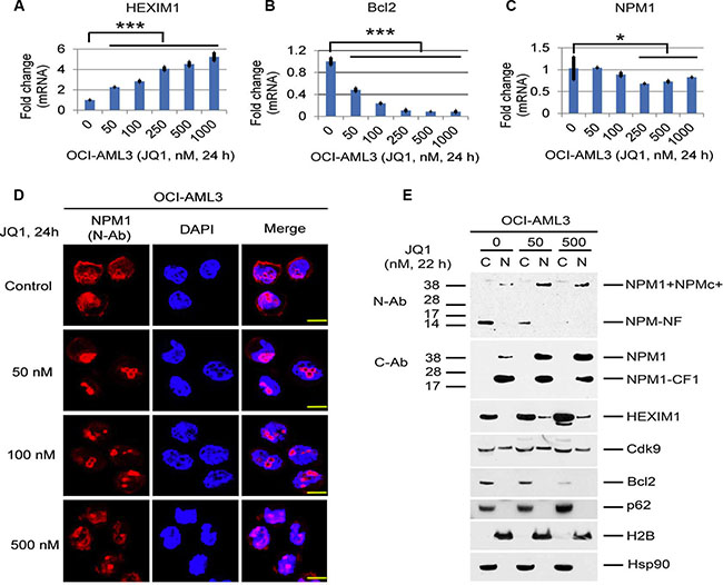 Figure 4: Effects of BET inhibitors on mRNA expression and the cellular distribution of NPM1/NPMc+ and HEXIM1 in OCI-AML3 cells. (A, B, C) Effects of JQ1 on the mRNA expression of NPM1, Bcl2, and HEXIM1 in OCI-AML3 cells. OCI-AML3 cells were untreated or treated with JQ1 at the concentrations shown for 24 h, followed by q-PCR analysis. The relative levels of mRNA expression were calculated using the 2−ΔΔCt method after normalization to the GAPDH level and were expressed as fold changes relative to control (set at 1). The mean ± S.D. of four replicates is represented in the bar graphs of Figure 4A, 4B, 4C. Asterisks (*) and (***) indicate p < 0.05 and p < 0.001, respectively, in relation to control cells. (D) Representative immuno-stained images of OCI-AML3 cells untreated or treated with JQ1 at the concentrations shown for 24 h. The N-terminal NPM1 antibody (N-Ab, green) recognizes both wt-NPM1 and NPMc+. The staining for DAPI was shown in blue. Scale bar, 200 px. (E) OCI-AML3 cells were untreated or treated with JQ1 at the indicated concentrations for 22 h, followed by cytoplasmic (column C) and nuclear (column N) fractionation and Western blot analysis.
