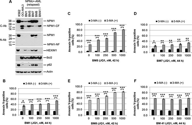 Figure 6: Effects of autophagy inhibition on JQ1-induced apoptosis in primary NPMc+ AML cells. (A) Western blots of lysates of leukemic blasts obtained from five NPMc+ AML patients with relapsed disease. (B, C, D, E, and F). Viable mononuclear leukemic cells from each patient were treated with 3-MA (5 mM) or JQ1 alone or in combination at the indicated concentrations and times, followed by flow cytometric analysis of Annexin V positivity. Bar graphs represent mean values ± S.D. of biological triplicate. Asterisks (*), (**), and (***) indicate p < 0.05, p < 0.01, and p < 0.001, respectively, in relation to cells without 3-MA treatment.