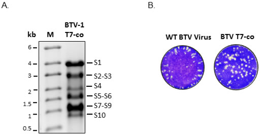 Figure 3: Synthesis and infectivity BTV-1 RNA segments. A. Co-transcription products of BTV-1 segments S1-S10 cDNA copies under the control of T7 promoter analyzed on a 1% denaturing agarose gel. M - ssRNA standard marker B. Plaques formed in cell transfected with WT BTV-1 or T7 Co-transcription products.
