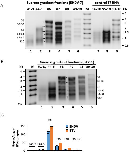 Figure 4: Formation and fractionation of S1-S10 RNA complexes. A. Co-transcription products of EHDV-7 S1-S10 segments fractionated on a 15-65% sucrose gradient and analyzed on a 1% denaturing agarose gel. Co-transcripts S6-S10, S5-S10 and S1-S10 from T7 cDNA were also analyzed as marker control. B. Co-transcription products of BTV-1 S1-S10 segments fractionated on a 15-65% sucrose gradient and analyzed on a 1% denaturing agarose gel. C. Virus plaque yield from ~1µg RNA complex fractionated by sucrose gradient ultracentrifugation and transfected on BSR cells, n = 3.