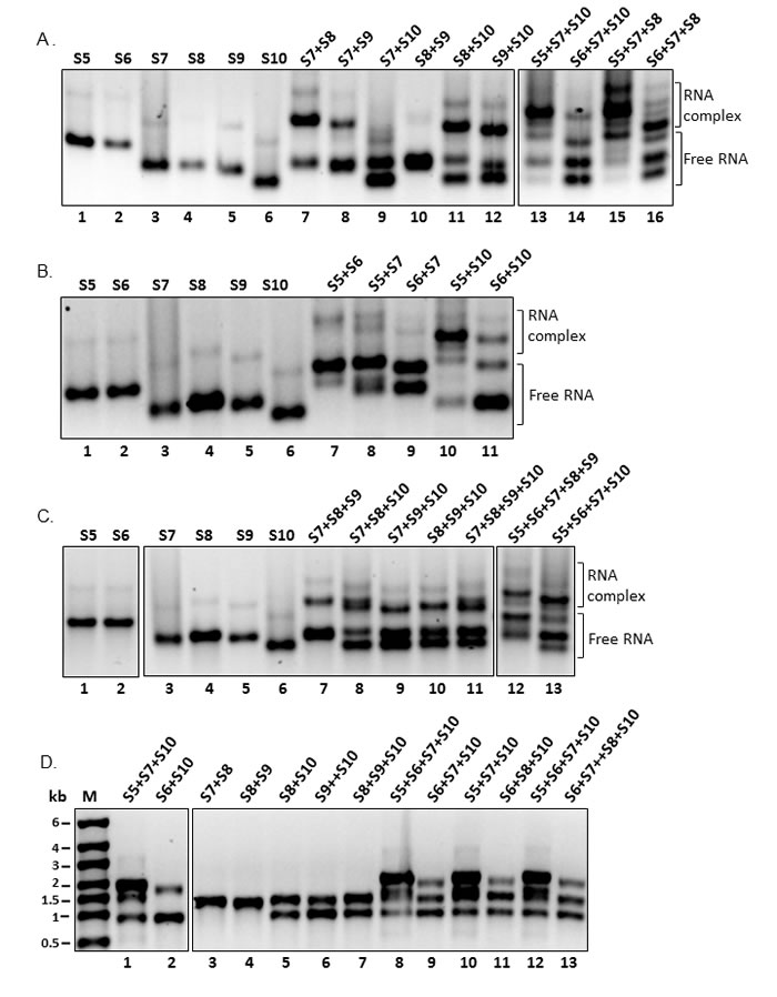 Figure 5: Interactions and complex formation of RNA segments showing the complex and free RNAs. A. Interactions of two and three co-transcribed small EHDV-7 RNA segments B. RNA-RNA interactions of medium sized and S5 or S6 + S10 EHDV-7 segments C. Interactions of multiple RNA combinations from co-transcription of small EHDV-7 RNA segments (RNA interactions of A.-C. were analyzed on a 1% native agarose gel electrophoresis in TBM buffer as described. D. Selected reactions from (A), (B) and (C) showing the integrity and mobility on a 1% denaturing gel electrophoresis in MOPS buffer.