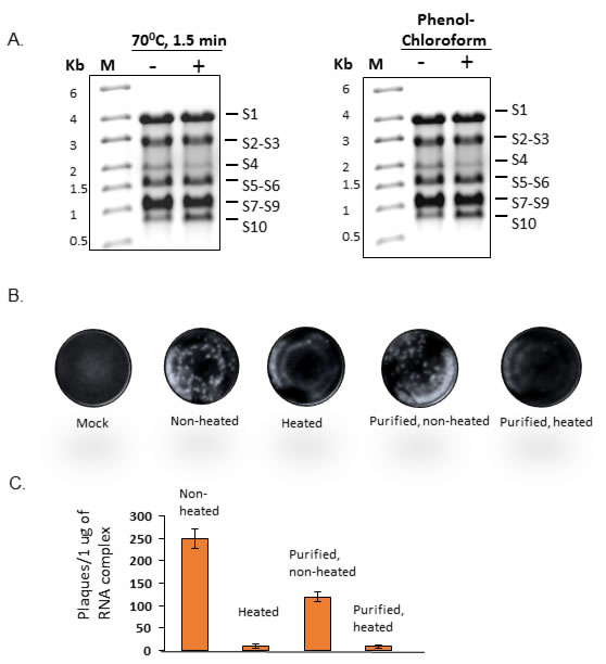 The results obtained from the above experiments demonstrated that RNA complexes were formed via RNA-RNA interactions and that the infectious complexes were sufficiently stable to tolerate isolation by sucrose gradient centrifugation. It was therefore imperative to confirm that disruption of RNA complexes would affect the virus recovery. To validate this, the 10 ssRNA transcripts were co-synthesized and products were divided into two aliquots. While one aliquot was subjected to heat treatment followed by flash cooling as described in Materials and Methods, the other was kept as control. BSR cells were then transfected with both aliquots and incubated for plaque formation. Results showed that the heated RNA products generated a markedly reduced number of plaques when compared to the untreated control (Figure 6A, left panel). In parallel, a second co-transcription reaction was also undertaken and an aliquot of the RNA complex products was then purified by standard phenol-chloroform extraction followed by lithium chloride precipitation, and then subjected to heat treatment as described (Figure 6A, right panel). A similar reduction in virus recovery was observed with treated product when compared to the non-treated control (Figure 6B and 6C). The denaturing agarose gel of the heated and purified RNA complexes in Figure 6B showed that the 10 ssRNAs were still complete even after purification and heating process prior to transfection as compared to the non-treated complex analyzed on the same denaturing gel. These data suggest that reduction of the virus recovery after treating the complex with heat or purification with phenol chloroform have possibly affected the inter-segment interactions, essential for RNA complex formation.