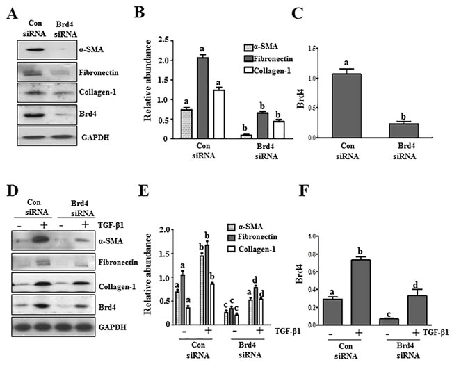 Figure 3: Knockdown of Brd4 with siRNA inhibits fibroblast activation. Serum-starved NRK-49F cells were transfected with siRNA targeting Brd4 or scrambled siRNA and then incubated in 5% FBS A.-C. or TGFβ1 (2 ng/ml) D.-F. for an additional 24 hours. Cell lysates were prepared for immunoblot analysis with antibodies against α-SMA, fibronectin, collagen1, or GAPDH A. and D. Expression levels of α-SMA, fibronectin, collagen 1, and Brd4 were quantified by densitometry and normalized with GAPDH B., C., E., and F.. Values are the means±SEM of at least three independent experiments. Bars with different letters (a-d) for each molecule are significantly different from each another (p < 0.05).