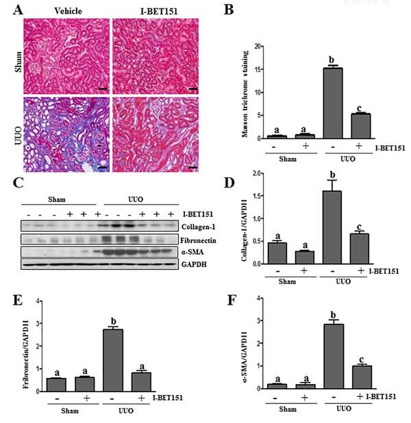 Figure 4: Administration of I-BET151 alleviates development of deposition of ECM in obstructed kidneys. A. Representative image of Masson trichrome staining of kidney. B. The Masson trichrome-positive tubulointerstitial area (blue) relative to the whole area from 10 random cortical fields was evaluated. Data are represented as the mean ± SEM (n = 6). C. Kidney tissue lysates were subjected to immunoblot analysis with antibodies against collagen-1, α-SMA, fibronectin, or GAPDH. Expression levels of collagen-1, fibronectin, α-SMA, and GAPDH were quantified by densitometry, and the levels of collagen1D., fibronectin E., and α-SMAF. were normalized with GAPDH. Values are the means±SEM (n = 6). Means with different letters (a-c) are significantly from one another (P < 0.05). Scale bar = 50µM.