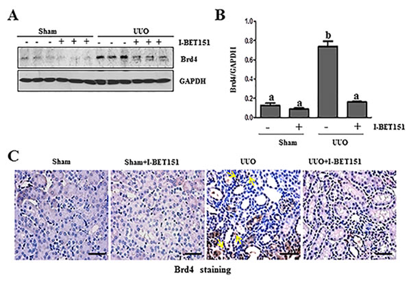 Figure 5: I-BET151 inhibits the expression of Brd4 in obstructed kidneys. The prepared tissue lysates from sham operated and obstructed kidneys of mice treated with or without I-BET151 were performed immunoblot analysis with antibodies against Brd4 and GAPDH A.. Quantification of Brd4 protein expression was normalized to GAPDH B.. Values are the means±SEM (n = 6). Means with different letters (a-b) are significantly from one another (P < 0.05). C. Representative image of Brd4 immunohistochemistry staining of kidney. Arrows indicate interstitial cells. Scale bar = 50µM.
