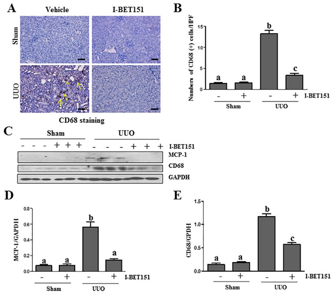 Figure 9: I-BET151 suppresses expression of MCP-1 and infiltration of macrophage in the obstructed kidneys. A. CD68 (a macrophage marker) was stained with immunohistochemistry. B. The corresponding group data show the number of positive staining cells per high power field (HP). C. Kidney tissue lysates were subjected to immunoblot analysis with specific antibodies against CD68, MCP-1, or GAPDH. Expression levels ofMCP-1D. and CD68 E. were quantified by densitometry and normalized with GADPH. Data are means ± SEM. Means with different superscript letters are significantly different from one another (P < 0.05). Yellow arrows indicate macrophages.