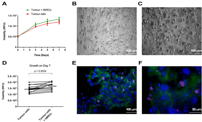 Figure 1: Growth in the 3D-TGA. Tumour cells were seeded in 3D-TGA with and without hMSCs. Growth of close-to-patient cells was determined in 3D-TGA over the 7 day assay using the alamarBlue assay. A. Progressive growth of tumour cells was monitored in 6 replicate wells immediately after establishment in 3D (day 0) and on days 3, 5 and 7. B., C. 3D cultures of live cells were imaged by wide-field microscopy with DIC at day 0 B. and day 7 C.. Images are extended depth of field projection of multiple z-stacks taken of Oes5R. D. The day 7 mean peak values from the growth curves were plotted in pairs, demonstrating a small but significant increase in growth in the models that incorporate mesenchymal support. E., F. Cell clusters with mCherry-labelled hMSCs (purple) at day 7 were extracted to glass slides and stained with anti-TFF3-AlexaFluor488 (green) and counter-stained with DAPI (blue), and imaged by fluorescence microscopy at x20 E. and x40 F. magnification.