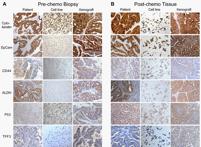 The phenotype of the close-to-patient cancer cells was compared with the corresponding primary patient cancer by IHC (Figure 2 and Table 2). Like the primary patient tissues, all were Cytokeratin, EpCam and p53 positive, confirming respectively the epithelial nature of the cells; their derivation from transformed metaplastic columnar-type epithelium (rather than adjacent normal squamous oesophageal epithelium); and neoplastic phenotype, as oesophageal p53 staining is not found in non-dysplastic Barrett’s Oesophagus. [11, 12] Trefoil Factor 3 (TFF3) is involved in protection, maintenance and repair of the intestinal mucosa, [13] specific for cells with an intestinal phenotype, [14] and is a reliable marker of metaplastic change in the oesophagus. [15] It was present in all of the primary patient cancer tissue, but absent in the feeder layer culture of the close-to-patient cancer cells, however expression was restored in both the 3D-TGA with mesenchymal support (Figure 1E, 1F) and xenografts (Figure 2). The potential oesophageal cancer stem cell (CSC) markers CD44 [16, 17] and ALDH [18, 19] were present in 11/17 (64.7%) and 13/17 (76.5%) of the samples respectively, and both were present in 9/17 (52.9%) of the samples (Table 2). Expression in the primary patient tumour was reflected in the corresponding close-to-patient cells and xenografts (Figure 2), suggesting maintenance of cells with a CSC-like phenotype in culture. Although numbers are small, the presence of ALDH and CD44 (either individually or together) did not relate to stage of disease, pre- or post-chemotherapy tissue status, the TRG, or in vitro growth.