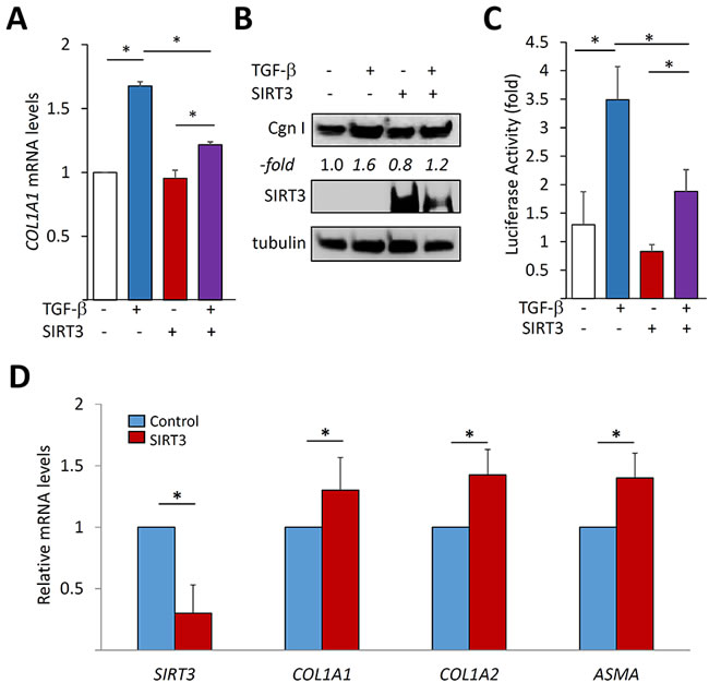 Figure 1: SIRT3 negatively regulates fibrotic responses. A.-C. Normal adult lung fibroblasts transfected with SIRT3 or empty vector were incubated with TGF-β2 (10 ng/ml) for 24 h. A. Results of real-time qPCR normalized with GAPDH are means ± SD of triplicate determinations from an experiment representative of three. *p < 0.05. B. Whole cell lysates were examined by Western analysis. Representative blots from an experiment representative of three; -fold change in band intensities normalized with tubulin shown below. Cgn I, Type I collagen. C. Fibroblasts were co-transfected [SBE]4-luc along with SIRT3 or empty vector. Whole cell lysates were analyzed for their luciferase activities. Results are the means ± SD of triplicate experiments. *p < 0.05. D. Fibroblasts were transiently transfected with SIRT3 siRNA or scrambled (control) siRNA and incubated for 48 h. Results of qRT-PCR normalized with GAPDH are means ± SD of triplicate determinations from an experiment representative of three. *p < 0.05.