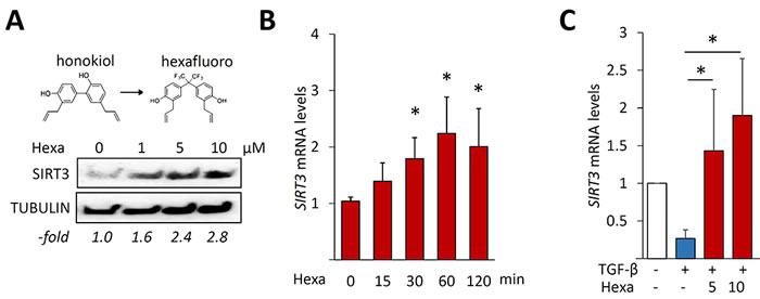Figure 2: Hexafluoro stimulates SIRT3 expression. Lung fibroblasts were incubated with hexafluoro (10 µM or indicated concentrations) for 24h or indicated periods, in the absence or presence of TGF-β2 (10 ng/ml and indicated times). A. Whole cell lysates were examined by Western analysis. Representative blots. – fold change in band intensities normalized with tubulin shown below. B., C. Real-time qPCR results normalized with GAPDH are means ±SD of triplicate determinations from an experiment representative of three. *, p < 0.05.