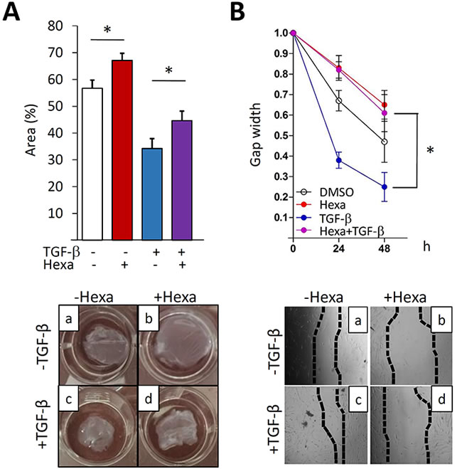 Figure 4: Hexafluoro attenuates TGF-β-induced cell contraction and migration. Lung fibroblasts were pretreated with 10 μM hexafluoro for 30 min, followed by TGF-β2 (10 ng/ml) for further 72 (A) and 48 h (B). A. Gel contraction assays (n = 3). Representative images. Results are means ±SD of triplicate experiments. *p < 0.05. B. Wound healing assays (n = 3). Representative images. Results are means ±SD of triplicate experiments. *p < 0.05.