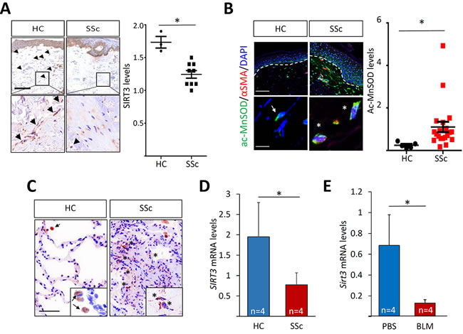 Figure 8: Attenuated SIRT3 expression and activity in SSc and in mouse models of fibrosis. A. Immmunohistochemistry of skin biopsies. Healthy control (n = 3) and dcSSc (n = 9) skin biopsies were evaluated using antibodies to SIRT3. Left panels, representative images. Arrowheads indicate immunopositive spindle-shaped cells within the dermis. Lower panels, higher magnification of boxed areas. Bar = 12.5 μm. Right panel, SIRT3 scores calculated as described in Materials and Methods. Bars represent the means ±SD; p < 0.05. B. Immunfluorescence. Left panels, immunostain of healthy control (n = 5) and SSc (n = 20) skin biopsies. Representative images. Green, Ac-MnSOD; red, αSMA; blue, DAPI. White dashed lines indicated epidermis-dermis junction. Arrows, Ac-MnSOD positive cells; star, Ac-MnSOD and αSMA double-positive cells. Bar = 100 μm (upper panels) and 10 μm (lower panels). Right panel, Ac-MnSOD levels. Each dot represents a biopsy. C. Immunohistochemistry of control (n = 3) and SSc (n = 6) lung biopsies using anti-Ac-MnSOD. Representative images. Inset, higher magnification. Arrow, Ac-MnSOD-positive alveolar macrophages; asterisk, Ac-MnSOD-positive stromal cells. Bar = 50 μm. D., E. Real-time qRT-PCR of lesional skin. Results, normalized with GAPDH, and the means ± SD of each group. *p < 0.05. D. RNA from confluent control (n = 4) and SSc (n = 4) skin fibroblasts was subjected to real-time qPCR. E. Mice treated with s.c. bleomycin (BLM; n = 4) or PBS (n = 4) for 14 days in parallel were sacrificed on day 28. RNA isolated from lesional skin was analyzed by qRT-PCR. Results, normalized with Gapdh, are means ± SD of each group. *p < 0.05.