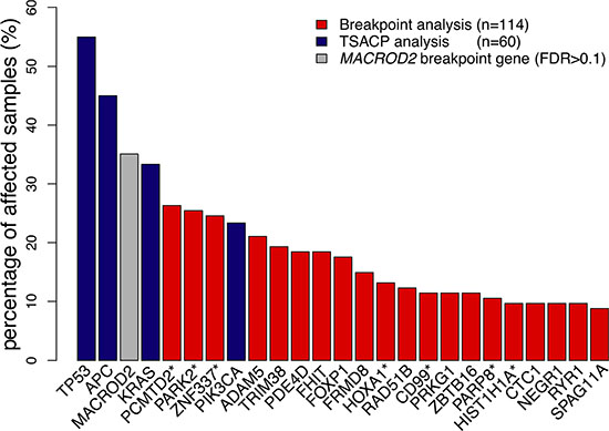 Figure 2: Gene breakpoint and gene mutation frequencies of the 25 most frequently affected genes in this series of colon cancers. Gene breakpoint frequencies (red bars) were based on the analysis of 114 colon cancer samples and gene mutation frequencies (blue bars) on the analysis of 60 samples. MACROD2 (grey bar) did not reach the level of significance in this series of samples (FDR = 0.17). Genes marked with a “*” indicate a pool of genes that share probe(s) associated with chromosomal breakpoints: the PCMTD2* pool also includes LINC00266-1; PARK2* also includes PACRG; ZNF337* also includes NCOR1P1, FAM182A, FAM182B, FRG1B, MIR663A and MLLT10P1; HOXA1* also includes HOXA2; CD99* also includes XG; PARP8* also includes EMB; HIST1H1A* also includes HIST1H3A. (See also Supplementary Table S5) The frequency of affected samples in the pool of genes was determined by the cumulative mutation frequency of pooled genes.