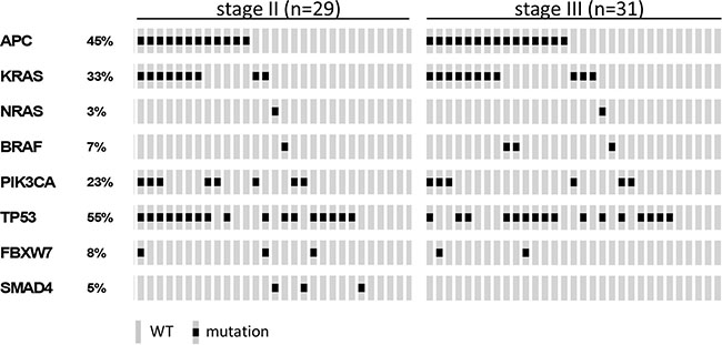 Figure 3: Oncoprint visualizing the gene mutation status of APC, KRAS, NRAS, BRAF, PIK3CA, TP53, FBXW7 and SMAD4 assessed by TruSeq Amplicon Cancer Panel TSACP analysis for stage II (n = 29) and stage III (n = 31) colon cancers. The rows indicate the gene mutation status of the 60 samples (grey bars) and the black spots depict mutations.