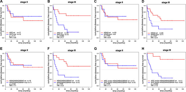 Figure 4: Kaplan-Meier curves of DFS for stage II and stage III colon cancer patients (n = 60). DFS curves were stratified for APC mutation in 29 stage II (A) and 31 stage III (B) colon cancer patients. Stage III colon cancers with an APC mutation were associated with a poor prognosis (p = 0.005; HR = 4.1). DFS curves stratified for KRAS mutation in stage II (C) and stage III (D) colon cancers showed that KRAS mutations were associated with a worse DFS in stage III (p = 0.07; HR = 2.4). DFS curves stratified for mutations in the KRAS/NRAS/BRAF MAPK pathway genes in stage II (E) and stage III (F) colon cancers showed that tumors with a mutation in one of the MAPK pathway genes were associated with a poor prognosis in stage III colon cancers (p = 0.02; HR = 3.2). DFS curve stratified for patients having a mutation in APC and/or MAPK pathway genes (KRAS, BRAF or NRAS) for stage II (G) and stage III (H) colon cancers showed that tumors with a mutation in APC and/or one of the MAPK pathway genes were associated with a poor prognosis in stage III colon cancers (p = 0.002; HR = 7.5).