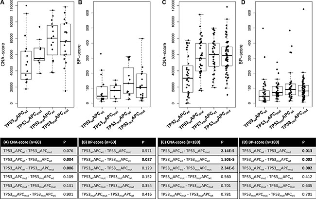 Figure 5: Boxplots of CNA- and BP-scores for four subgroups of CRC samples stratified for APC and TP53 mutation status. (A) CNA-scores and (B) BP-scores for stage II and III MSS colon cancers (n = 60). Statistical analyses using two-sided Mann-Whitney U tests revealed that TP53 mutation was associated with increased CNAs (p = 0.004) and BPs (p = 0.03). (C) CNA-scores and (D) BP-scores for advanced MSS CRC samples [13]. Both APC and TP53 mutations were associated with increased CNA- and BP-scores.