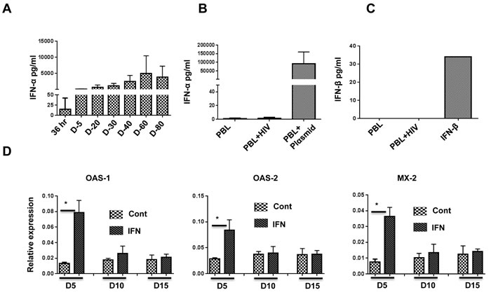 Figure 1: IFN-α is induced after HIV-1 infection in BLT but not Hu-PBL mice, and pegasys treatment in Hu-PBL mice upregulates ISGs. A., B. Sera of HIV-1-infected BLT mice A. and Hu-PBL mice B. at the indicated time points were tested for expression of IFN-α by ELISA. In B., PBL refers to uninfected Hu-PBL mice (negative control), PBL + HIV indicates infected mice (test group), and PBL + Plasmid indicates sera from Hu-PBL mice injected with IFN-α-encoding plasmid (positive control). For A. and B., n = 6 mice/group. C. HIV-infected Hu-PBL mice were tested for expression of IFN-β by ELISA. The positive control was soluble IFN-β; n = 6 mice. D. ISG expression in PBMCs isolated from control and pegasys (200 ng)-injected mice at the indicated time points was tested by qRT-PCR; n = 4 mice. Cont, untreated control mice. IFN, pegasys-treated mice. Error bars = 1 SD. Statistical analysis was carried out using non-parametric Mann-Whitney test.