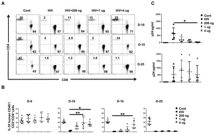 Figure 2: IFN-α2 (pegasys) treatment delays HIV disease progression in Hu-PBL mice. A., B. Hu-PBL mice were treated with the indicated doses of pegasys and infected 2 days later with HIV-1BaL. Pegasys treatment was repeated on days 8 and 18 after infection. Blood collected at the indicated number of days after infection was tested for CD4 T cell depletion by flow cytometry. A representative flow cytometric profile of CD4 and CD8 T cells within the human CD45-gated cell population A., and cumulative data from 6 mice B. is shown. In B, each symbol represents an individual mouse. Cont, uninfected Hu-PBL mice; HIV, untreated HIV-1-infected Hu-PBL mice; 200ng, 1ug, 4ug, infected mice treated with the indicated doses of pegasys. C. Plasma from mice in B. was tested by p24 ELISA on the indicated days after infection. Each symbol represents an individual mice. n = 5 mice/group. For statistical analysis, non-parametric Kruskal Wallis test followed by Dunn’s multiple comparison analysis was done. *p < 0.05; **p < 0.01.