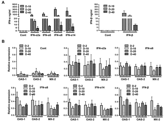 Interferons (IFNs) are a family of cytokines with antiviral, anti-proliferative, and antitumor effects as well as modulatory effects on the innate and adaptive immune responses (reviewed in [1]). IFNs are classified into three types: type I (IFN-α, IFN-β, IFN-ω, IFN-ε, and IFN-κ), type II (IFN-γ), and type III (IFN- λ1, IFN- λ2, and IFN-λ3) [2]. Among the IFN-I, IFN-α and IFN-β have been well studied. IFN-α actually consists of 12 unique subtypes expressed by separate tandemly arranged genes on human chromosome 9, whereas IFN-β exists as a single member [2, 3]. Antibodies specific to different IFN-α subtypes are not available, making studies to test the role of individual subtypes difficult. Because of extensive sequence homology, designing RT-PCR primers is also difficult. For these reasons, the well-studied IFN-α2 subtype is the only one that is currently licensed to treat infections caused by hepatitis B virus (HBV) and HCV [4].