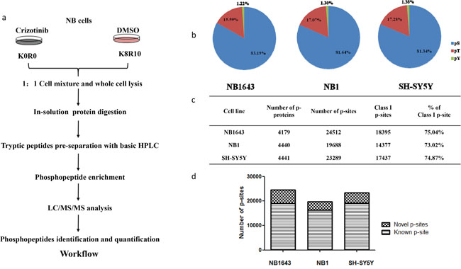 Figure 1: Phosphoproteomics profiling for ALK regulated phosphoproteome in neuroblastoma. a. Strategy for global analysis ALK regulated phosphoproteome; b. Distribution of phosphorylation sites by amino acid; c. Number of phosphoprotein and phosphorylation sites identified in three cell lines; d. Number of novel phosphorylation sites identified in the indicated cell lines.