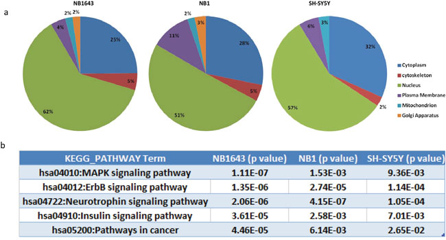 Figure 3: Bioinformatic analysis of the ALK regulated phosphoproteome. a. Subcellular localization of the phosphorylation proteins regulated by ALK; b. Top KEGG pathways enriched by ALK regulated phosphoprotein in three neruoblastoma cell lines.