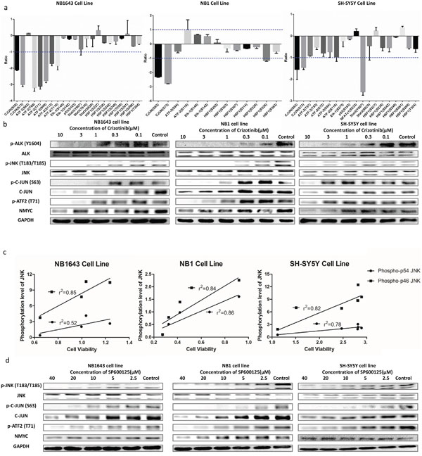 Figure 4: ALK mediates cell viability through JNK signaling pathway. a. MS quantification result of the phosphorylation sites of the JNK downstream signaling pathways; b. Western blot concentration course analysis of cells treated with Crizotinib further confirms the inhibition of JNK signaling pathway; c. JNK1/2 phosphorylation level well correlates with cell viability after treating with Crizotinib; d. Western blot analysis of cells treated with SP600125 shows similar result of that treated with Crizotinib.