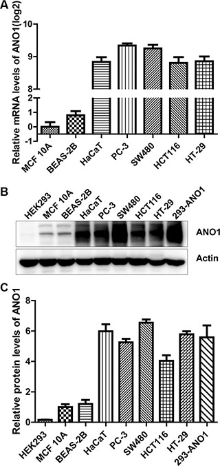Figure 1: Comparison of ANO1 expression levels in multiple epithelial cell lines. (A) ANO1 mRNA expression in seven cell lines was determined by quantitative real-time PCR. The mRNA expression of ANO1 was much higher in human keratinocyte HaCaT, prostate cancer cell line PC-3, colon cancer cell lines SW480, HCT116 and HT-29 than that in normal breast epithelium MCF 10A and bronchial epithelial cell line BEAS-2B. (B) ANO1 protein expression in the cell lines was detected by Western blot. Higher expression of ANO1 was confirmed in cell lines of HaCaT, PC-3, SW480, HCT116 and HT-29 than MCF 10A and BEAS-2B. HEK293 cells transfected with ANO1 plasmid were used as positive control. (C) Quantitative analysis of ANO1 protein expression in cell lines from B.