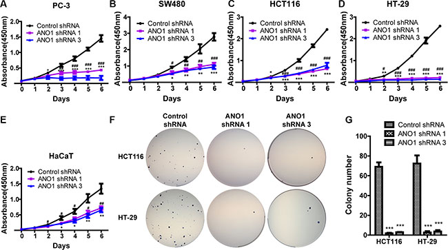 Figure 2: Silencing ANO1 inhibits cell proliferation. (A–E) Cell proliferation of the indicated cell lines was assessed by CCK8 assay. Three days after lentiviral infection of ANO1 shRNAs, cells were re-plated into 96-well plates and cell proliferation was measured every day for six days. Silencing ANO1 resulted in significant inhibition of cell viability in a time-dependent manner. Data are expressed as mean ± SEM; n = 4; #P < 0.05, ##P < 0.01 and ###P < 0.001 are for statistical comparisons of ANO1 shRNA 1 versus control shRNA; *P < 0.05, ** P < 0.01 and *** P < 0.001 are for statistical comparisons of ANO1 shRNA 3 versus control shRNA. (F) Representative images of colony formation in soft agar assay. Knockdown of ANO1 by ANO1 shRNA1 or shRNA3 decreased the colony-formation capacity of HCT116 and HT-29 as compared with control shRNA. (G) Quantitative analysis of colony numbers from F. Data are expressed as mean ± SEM; n = 3; ***P < 0.001.