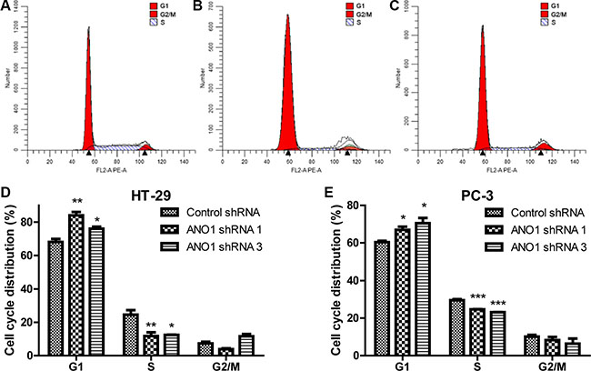 Figure 3: Flow cytometric analysis of the cell cycle distribution in colon cancer HT-29 and prostate cancer PC-3 cells. Flow cytometric analysis of the cell cycle distribution in colon cancer HT-29 cells infected with control shRNA virus (A), ANO1 shRNA 1 virus (B) and ANO1 shRNA 3 virus (C) respectively. Bar graphs showing an increase of G1 phase and a decrease of S phase in cell cycle for the percentage of indicated cells after ANO1 silencing in HT-29 (D) and PC-3 (E) cell lines. Data are expressed as mean ± SEM; n = 3; *P < 0.05; **P < 0.01; ***P < 0.001.