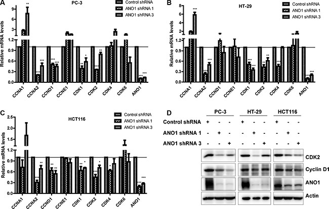 Figure 4: Analysis of mRNA and protein levels of cyclins and CDKs in PC-3, HT-29 and HCT116 cells after ANO1 knockdown. Four days after lentiviral infection of ANO1 shRNAs, the mRNA levels of several cyclins and CDKs were examined by real-time PCR. Bar graphs showing reduced expressions of cyclin D1 (CCND1), cyclin A2 (CCNA2), CDK1 and CDK2 in prostate cancer PC-3 cells (A), decreased expressions of cyclin A2, CDK1 and CDK2 in colon cancer HT-29 cells (B), and reduced expressions of cyclin D1, cyclin A2, CDK1 and CDK2 in colon cancer HCT116 cells (C). Data are expressed as mean ± SEM; n = 3–4; *P < 0.05; **P < 0.01; ***P < 0.001. (D) Western blot shows a decreased expression of CDK2 and cyclin D1 in the indicated cells after knockdown of ANO1.