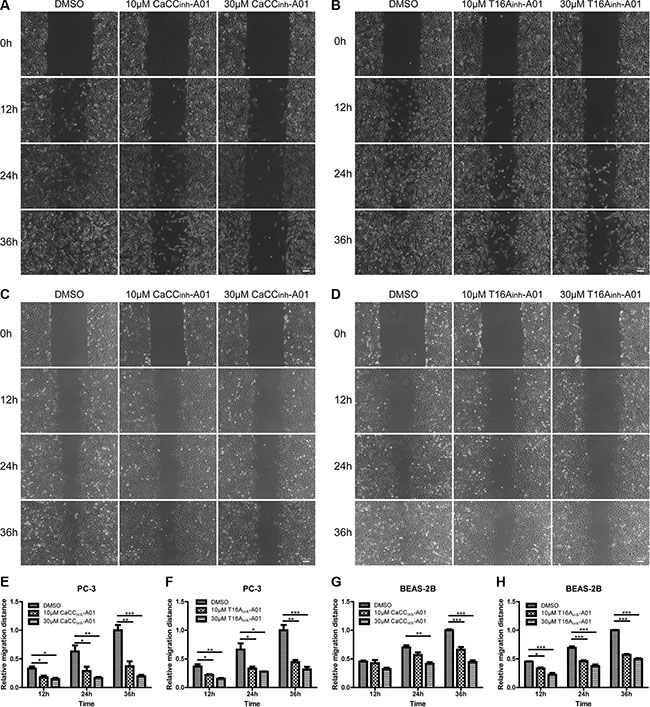 Figure 7: Suppression of cell migration of PC-3 and BEAS-2B cells by ANO1 inhibition in wound-healing assay. Cell migration was assessed by wound-healing assay in the presence of ANO1 inhibitor or DMSO control. Images of wound closure in prostate cancer PC-3 cells treated with different concentrations of CaCCinh-A01 (A) or T16Ainh-A01 (B) were taken at 0 h, 12 h, 24 h and 36 h. Representative images of bronchial epithelial BEAS-2B cells treated with CaCCinh-A01 (C) or T16Ainh-A01 (D) were presented. Scale bar: 100 μm. (E–H) Bar graphs of panel A–D showing treatment of PC-3 and BEAS-2B cells with CaCCinh-A01 or T16Ainh-A01 suppressed cell migration. Data are expressed as mean ± SEM; n = 3; * P < 0.05; ** P < 0.01;*** P < 0.001.