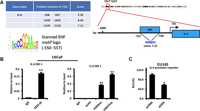 Figure 2: ESE3/EHF transcriptionally represses IL-6. (A) Predicted ETS binding sites (EBS) in the human IL-6 promoter (left). Position relative to the transcription start site (TSS) of the gene, sequence, corresponding scores (right) and EHF scanned motif logo (lower left). (B) Binding of ESE3/EHF to the IL-6 promoter (left panel) and chromatin marks (right panel) determined by chromatin immunoprecipitation (ChIP) in LNCaP cells. (C) Transcriptional activity of IL-6 promoter reporters in control (pcDNA) and stably ESE3/EHF expressing (pESE3) DU145 cells evaluated by dual luciferase assay. P values were determined using t-test. *P < 0.05; **P < 0.01. Data are representative of three independent experiments.