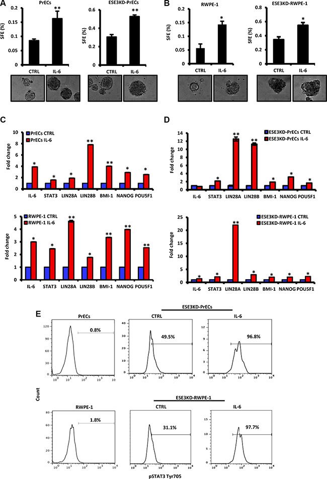 Figure 4: IL-6 induces transformation and cancer stem-like phenotypes in normal and more significantly in ESE3KD prostate epithelial cells. (A–B) Sphere forming efficiency (SFE) in PrECs and ESE3KD-PrECs (A) and in RWPE-1 and ESE3KD-RWPE-1 (B) cells after IL-6 treatment in vitro. (C–D) mRNA levels of STAT3, IL-6 and indicated genes evaluated by qRT-PCR in PrECs and ESE3KD-PrECs (left) (C) and in RWPE-1 and ESE3KD-RWPE-1 cells (right) (D) following 4 hours of treatments in vitro with IL-6 (50 ng/ml) or DMSO as control (CTRL). Data are presented as fold change relative to control (CTRL) cells. (E) Flow cytometry analysis of STAT3-Tyr705 staining following IL-6 treatment of control PrECs and ESE3KD-PrECs (upper) and RWPE-1 and ESE3KD-RWPE-1 (lower) cells. Percentages of positive cells are shown. P values were determined using t-test. *P < 0.05; **P < 0.01. Data are representative of three independent experiments.