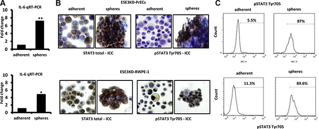 Figure 5: IL-6 elevation and STAT3 induction in cancer stem-like compartment of ESE3KD prostate epithelial cells. (A) IL-6 mRNA level evaluated by qRT-PCR in adherent and prostatosphere cells derived from ESE3KD-PrECs (top) and ESE3KD-RWPE-1 (bottom) cells. Data are presented as fold change relative to the corresponding adherent cells. (B) ICC staining for STAT3 total and pSTAT3-Tyr705 for adherent cells and prostatospheres derived from ESE3KD-PrECs (upper) and ESE3KD-RWPE-1 (lower) cultures. (C) Flow cytometry analysis of STAT3-Tyr705 staining for indicated cells. Percentages of positive cells are shown.