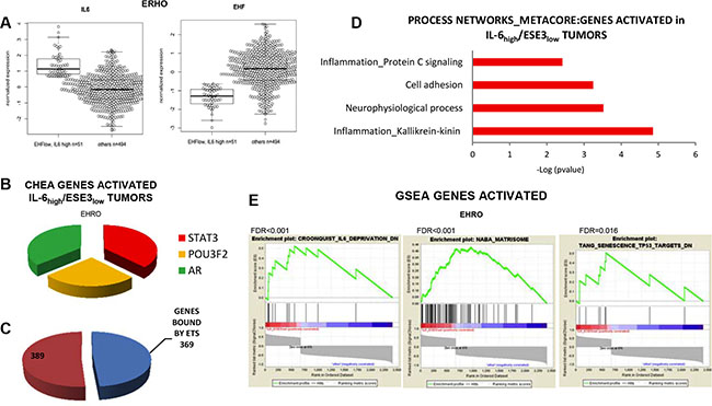 Figure 7: IL-6 elevation and loss of ESE3/EHF are associated with STAT3 activation and inflammatory features in human prostate tumors. (A) Box–plots showing the level of IL-6 (left) and ESE3/EHF (right) in the selected tumor populations. (B) Transcription factor analysis of the top genes activated in IL-6high/ESE3low compared to all the other tumors using CHEA by Enrich. (C) Number of ESE3/EHF putative binding sites among the top activated genes in the IL-6high/ESE3low signature. (D) Functional annotation analysis by Metacore using the upregulated genes. (E) GSEA using indicated list of genes and comparing IL-6high/ESE3low with all the other tumors in the EHRO dataset.