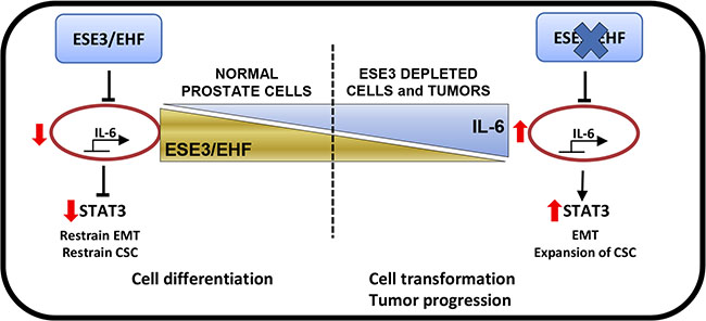 In this study we report a link between the tumor suppressor ESE3/EHF and IL-6. Specifically, loss of ESE3/EHF leads to upregulation of IL-6 and activation of the JAK/STAT3 pathway with consequent induction of EMT and expansion of the cancer stem cell compartment (Figure 8).