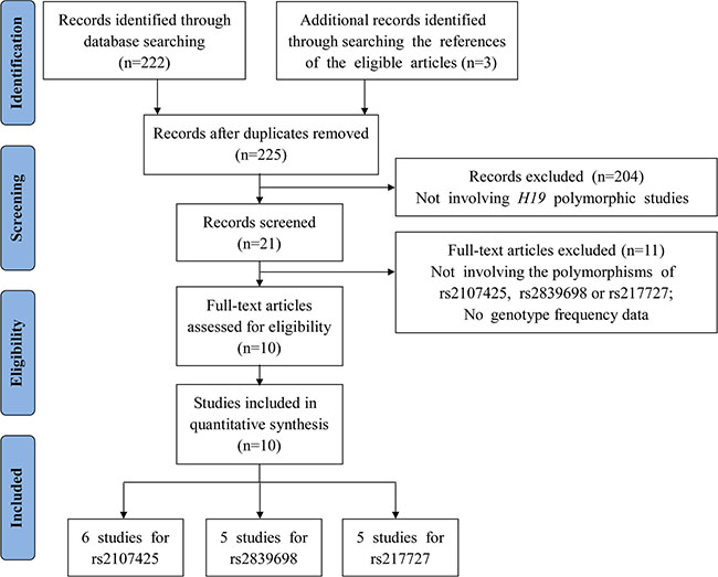 A comprehensive literature search of research published before July 31, 2016 was performed using PubMed and Web of Science using the following keywords: (“H19”), (“cancer”, “carcinoma”, “tumor”, “tumour”, or “neoplasm”) and (“polymorphism”, “variation”, “variant”, or “mutation”). Only available full-text articles written in English were included in this meta-analysis. The references in the retrieved articles were also reviewed for possible inclusion. Studies were included if they met the following eligibility criteria: (1) case-control studies focused on the relationship between H19 polymorphisms and any type of cancer, (2) at least two articles for each studied H19 polymorphism, and (3) available information concerning the genotype frequency of each included H19 SNP (i.e., rs2107425, rs2839698 or rs217727). The exclusion criteria were as follows: (1) Studies that did not focus on cancer risk, (2) did not study H19 SNPs (rs2107425, rs2839698 or rs217727), (3) did not report the relevant genotype frequency data, (4) were not published in English, or (5) non-human research was involved. Finally, a total of 10 articles containing 13,392 cases and 18,893 controls were included in this meta-analysis (Figure 1).