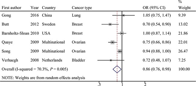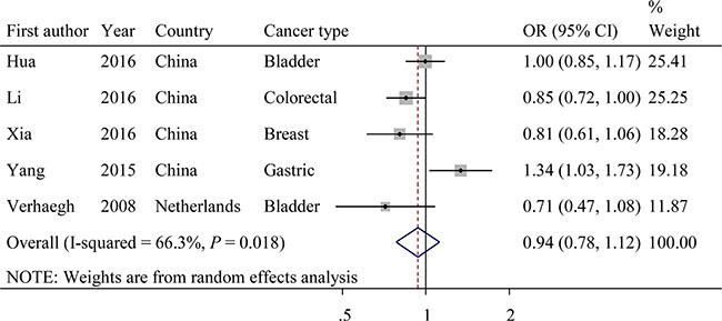 Table 2: Summary ORs of the H19 rs2107425 polymorphism and cancer risk