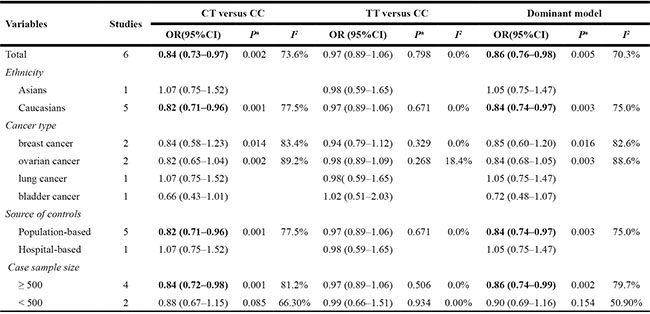 Table 4: Summary ORs of the H19 rs217727 polymorphism and cancer risk