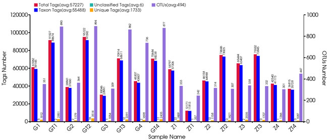 Figure 1: Statistical information of original data. The first vertical axis (Tags numbers):Total Tags means the number of merged tags after filtering; Taxon Tags means the number of tags which were used for establishing OTU table and obtained taxonomic information; Unclassified Tags means the number of tags which were used for establishing OTU table but did not obtain taxonomic information; Unique Tags means the number of tags whose frequency was 1 and can’t be assigned to any OTUs. The second vertical axis (OTUs Number) represents the final OTU number after taxonomic analysis.