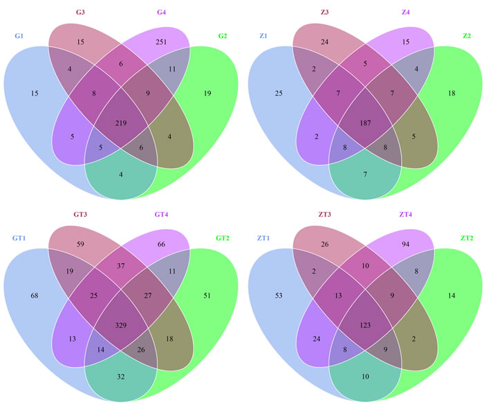 Figure 2: Scalar-Venn representation of shared genera among microbiomes associated with 4 sites in two patients before and after treatment. G1-4 and Z1-4 meaned the samples from patient G and patient Z before treatment respectively. GT1-4and ZT1-4 meaned the samples from the patient G and patient Z after treatment (represent as GT and ZT) respectively. The overlap section represented the shared OTUs between different samples.