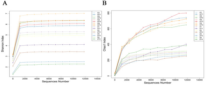 Figure 3: The rarefraction curves of Shannon index A. and Chao1 index B. The horizontal axis represented sequence number, the vertical axis represented the shannon index in A. and chao1 index in B.