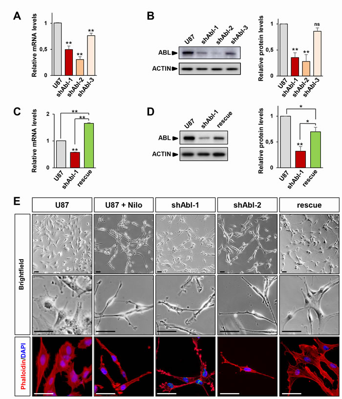 Figure 1: ABL impairment confers mesenchymal morphology of U87 cells. A, B. RT-qPCR (A) and western blot (B) analyses of ABL expression levels in U87shABL cells (U87 transfected with shABL-1, shABL-2, and shABL-3) compared to controls. Note ABL down-regulation in U87shABL cells versus controls (for shABL-1: mRNA 0.5±0.06 fold change; protein: 0.35±0.09 fold change; for shABL-2: mRNA 0.3±0.05 fold change; protein: 0.28±0.13 fold change; for shABL-3: mRNA 0.76±0.04 fold change; protein: 0.86±0.06 fold change). C., D. RT-qPCR (C) and western blot (D) analyses of ABL expression levels in U87rescue compared to U87shABL (U87 transfected with shABL-1) cells and controls. Note increased ABL levels in U87rescue versus U87shABL cells (mRNA: 1.65±0.03 fold increase; protein: 0.69±0.08 fold increase). The housekeeping gene Beta-2-microglobuline (B2M) was used as internal control in all RT-qPCR analyses, and ACTIN as loading control in all western blots. Results are the mean of at least three independent experiments. Values are expressed as means ± s.e.m. ns: not significant; * P < 0.05; ** P < 0.01. E. Brightfield (top and middle) and phalloidin staining (red; bottom) images of untreated U87, U87 cells exposed to Nilotinib (2µM; for 72 hrs), U87shABL (shABL-1 and shABL-2), and U87rescue cells. Note that ABL inhibition leads to the acquisition of a fusiform cell shape whereas U87rescue cells exhibit a flatter phenotype. Nuclei stained with DAPI are in blue. Scale bars: 50µm.