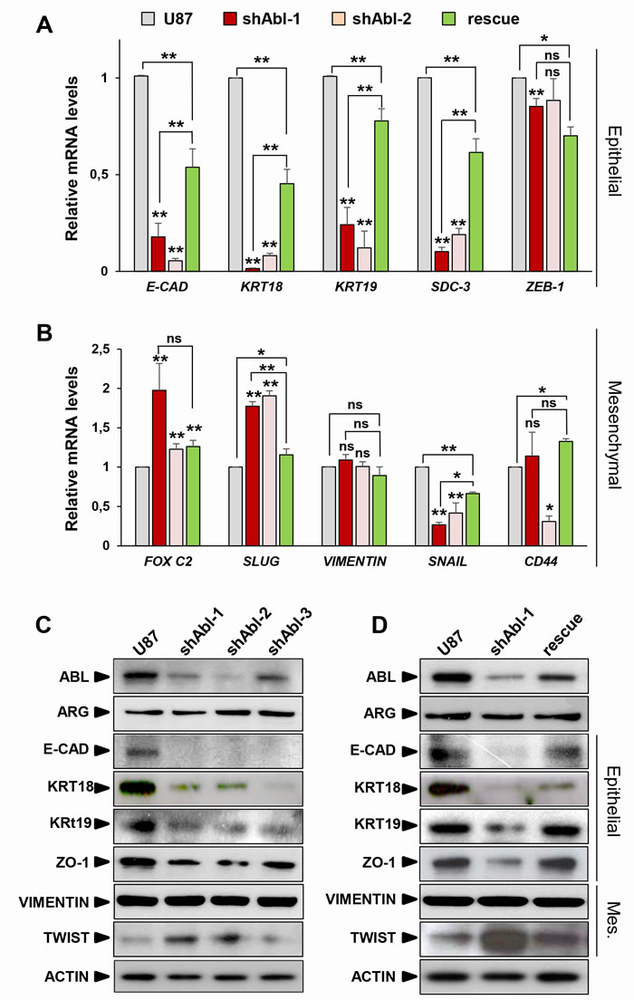 Figure 2: ABL impairment increases mesenchymal molecular traits at the expense of epithelial markers. (A, B) RT-qPCR analysis showing repression of the epithelial markers (A), such as E-Cadherin (E-CAD), Cytokeratin-18 (KRT18), Cytokeratin-19 (KRT19), Syndecan-3 (SDC-3), and ZEB-1. Concerning mesenchymal markers (B), FOX C2 and SLUG, but not VIMENTIN, are up-regulated in U87shABL cells compared to controls. Note down-regulation of SNAIL levels in U87shABL cells. Levels of CD44, which is considered as a marker of mesenchymal or stemness traits depending on the culture conditions, are also reported. Quantitative analysis in U87rescue cells shows significant increase of all epithelial markers accompanied by a decreased expression of FOX C2 and SLUG mesenchymal markers. C, D. Western blots showing decrease in the expression levels of E-Cadherin (E-CAD), Cytokeratin-18 (KRT18), Cytokeratin-19 (KRT19), Zonal Occludens-1 (ZO-1), and increase of TWIST-1 (TWIST) in U87shABL compared to controls (C). Restoration of E-CAD, KRT18 (although only partial), KRT19, and ZO-1 levels together with a decrease in TWIST levels were observed in U87rescue cells (D). Mes: Mesenchymal. Results are the mean of three independent experiments. Values are expressed as means ± s.e.m. ns: not significant; * P < 0.05; ** P < 0.01.