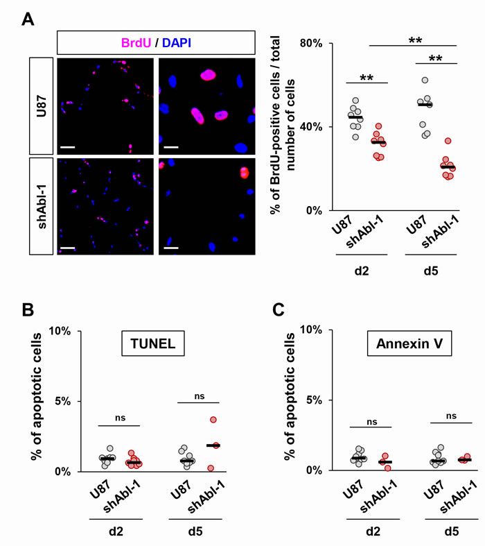 Figure 4: ABL inhibition decreases cell proliferation without affecting cell survival. A. Representative images (left) and quantification (right) of cell proliferation determined by analysis of BrdU incorporation. The proliferation rate of U87shABL cells is reduced compared to control cells (at day2, U87:44.2±1.9%; U87shABL:31.6±2.25%; at day5, U87:47.5±3.7%; U87shABL:21.3±2%). Scale bars correspond to 250µm (left) and 50µm (right). B, C. Quantitative analysis of apoptotic cells as assessed by either TUNEL (B) or Annexin V expression (C) in U87 and U87shABL cells. Each dot represents the mean of independent experiments. ns: not significant; ** P < 0.01.