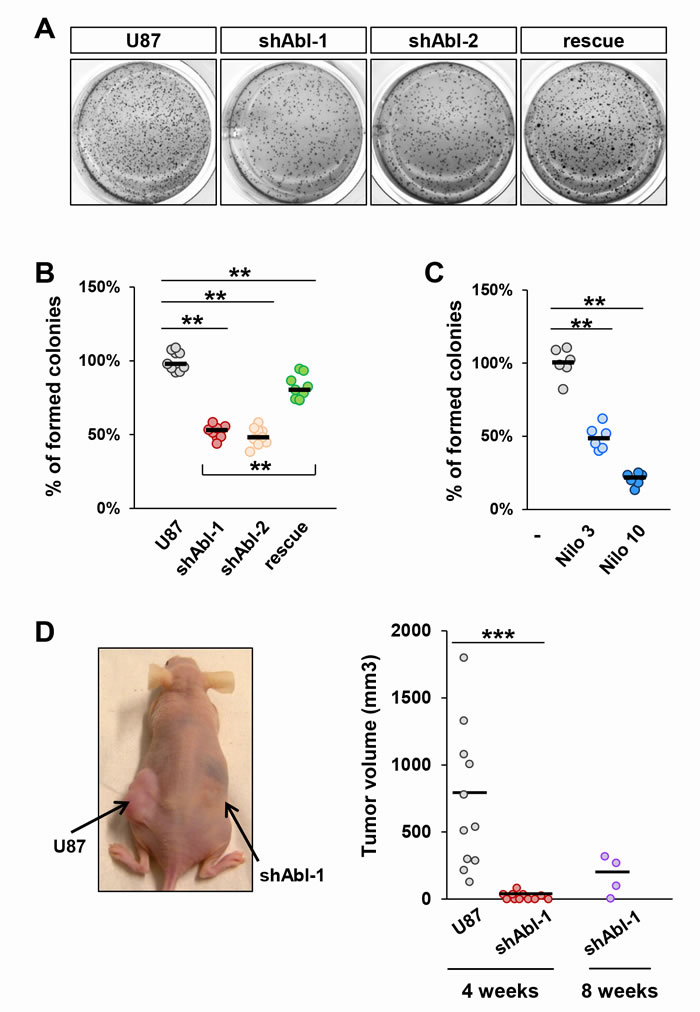 Figure 5: Tumorigenic properties of U87 cells are impaired by ABL inactivation both in vitro and in vivo. A-C. Anchorage-independent growth assay showing reduced in vitro tumorigenic properties of U87shABL (shABL-1: 52.05±2.1%; shABL-2: 48.9±2.2%) and partial restoration in U87rescue cells (A and B; 81.8±2.3%;). Reduced tumorigenic properties of Nilotinib-treated U87 cells compared to controls (C; 3µM: 49.2±3.3%; 10µM: 20.7±1.7%). Each dot represents the mean of independent experiments. D. Xenograft studies were performed by subcutaneous injection of U87 (left flank) and U87shABL (right flank) cells. A representative mouse 4 weeks after injection is shown (left panel). Quantitative analysis of the volume of dissected tumours 4 and 8 weeks after cell injection (right panel). Note that after 4 weeks, U87 cells formed in all injected mice tumours of an average volume of ~720 mm3, whereas U87shABL cells exhibited a drastically reduced capacity to form tumours (mean tumour volume: ~20mm3), which were detected in only 54% of injected mice. After 8 weeks, the mean of tumour volume generated by U87shABL cells was ~170 mm3. Each dot corresponds to the tumour value of one mouse. ** P < 0.01; *** P < 0.001.