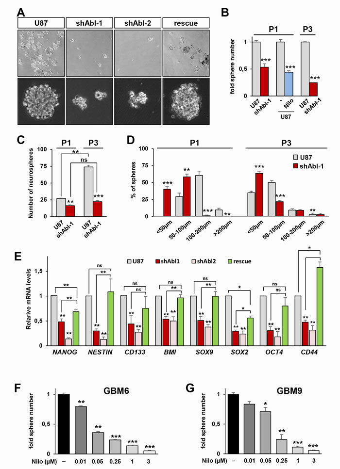 Figure 6: Permanent ABL inhibition interferes with neurosphere formation and expression of self-renewal markers in GBM cells. A. Representative images of spheres derived from U87, U87shABL, and U87rescue cells. B, C. Reduced numbers of spheres derived from U87shABL versus U87 cells at passage 1 (P1) and 3 (P3). Nilotinib treatment (Nilo; 3µM) also reduces the number of U87 spheres at P1. In B, results are expressed as fold changes in sphere numbers between cells with ABL inhibition versus controls. In C, results are expressed in terms of number of formed spheres compared to the number of seeded cells. This way of reporting data determines the sphere forming efficiency of each cell line, emphasizing differences in self-renewal capacity. Note that as the number of passages increases (from P1 to P3), the sphere forming efficiency of U87 cells raises up (2.7 fold), whereas the capacity of U87shABL cells does not significantly change. D. Size of spheres derived from U87 and U87shABL cells analysed after P1 and P3. E. RT-qPCR analyses showing the repression of pluripotent markers (NANOG, NESTIN, CD133, BMI, SOX9, SOX2, OCT4, and CD44) in U87shABL compared to U87 spheres. Partial restoration of most of the stemness markers was observed in U87rescue cells. Data correspond to biological triplicates. F, G. GBM6 (F) and GBM9 (G) cells in neurosphere conditions were exposed to various doses of Nilotinib (µM). Sphere numbers were quantified after 14 days of culture. Each experiment was done in triplicate. Values are expressed as means ± s.e.m. ns: not significant; * P < 0.05; ** P < 0.01; *** P < 0.001.
